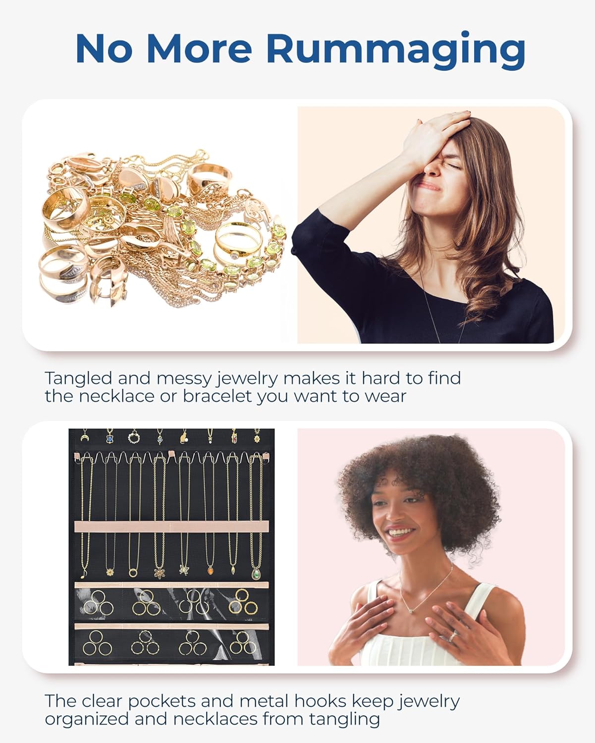 【Quick Access】: This necklace organizer boasts 3 rows of delicate wave-shaped metal hooks, providing storage for a minimum of 42 necklaces. Its design with elastic bands keeps the necklaces separated and tangle-free, ensuring convenient access and solving the issue of tangled necklaces during storage. Elevate your lifestyle with added elegance and ease.